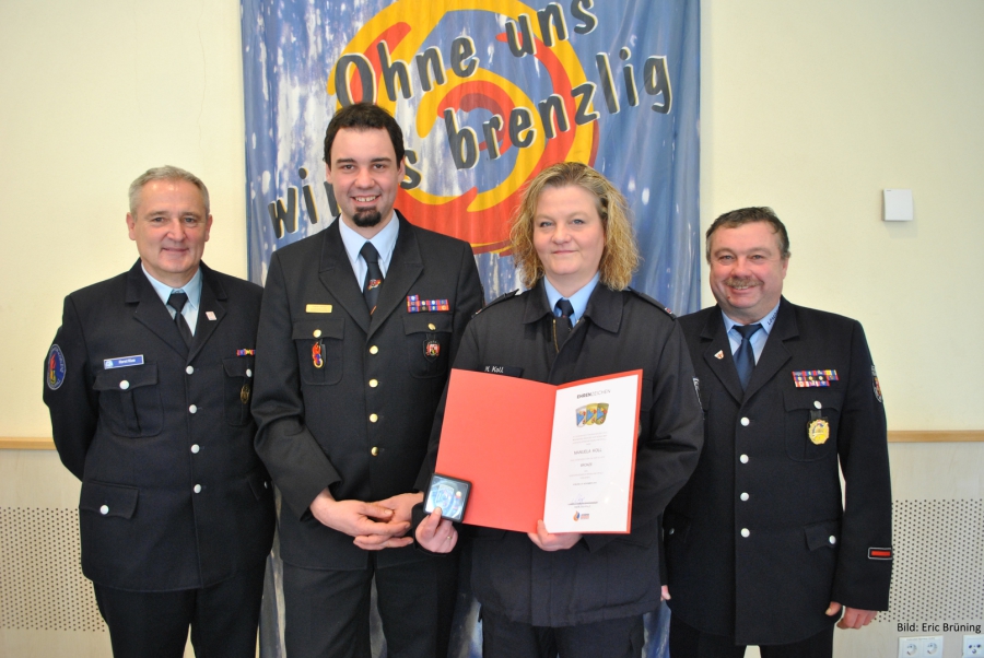 Doch dann wurde es nochmal feierlich: Manuela Koll von der Feuerwehr Andernach-Miesenheim konnte aus den Händen von Tobias Zelter, dem stellvertretenden Landesjugendfeuerwehrwart und Horst Klee das Ehrenabzeichen der Jugendfeuerwehr Rheinland-Pfalz in Bronze erhalten. Auch ein kleines symbolisches Dankeschön für die Arbeit mit Feuerwehrmann Thomas Blum, der im vergangenen Jahr bei einem tragischen Unfall aus der Feuerwehrfamilie gerissen wurde. Beide waren seit vielen Jahren in den beliebten Zeltlagern des Kreises für die Verpflegung mit der Feldküche für die Teilnehmer mit großem Einsatz und Herzblut dabei. Der gesamte Vorstand der Kreisjugendfeuerwehr wünschte den angereisten Vertretern aus dem gesamten Kreisgebiet für 2017 eine tolle Nachwuchsarbeit